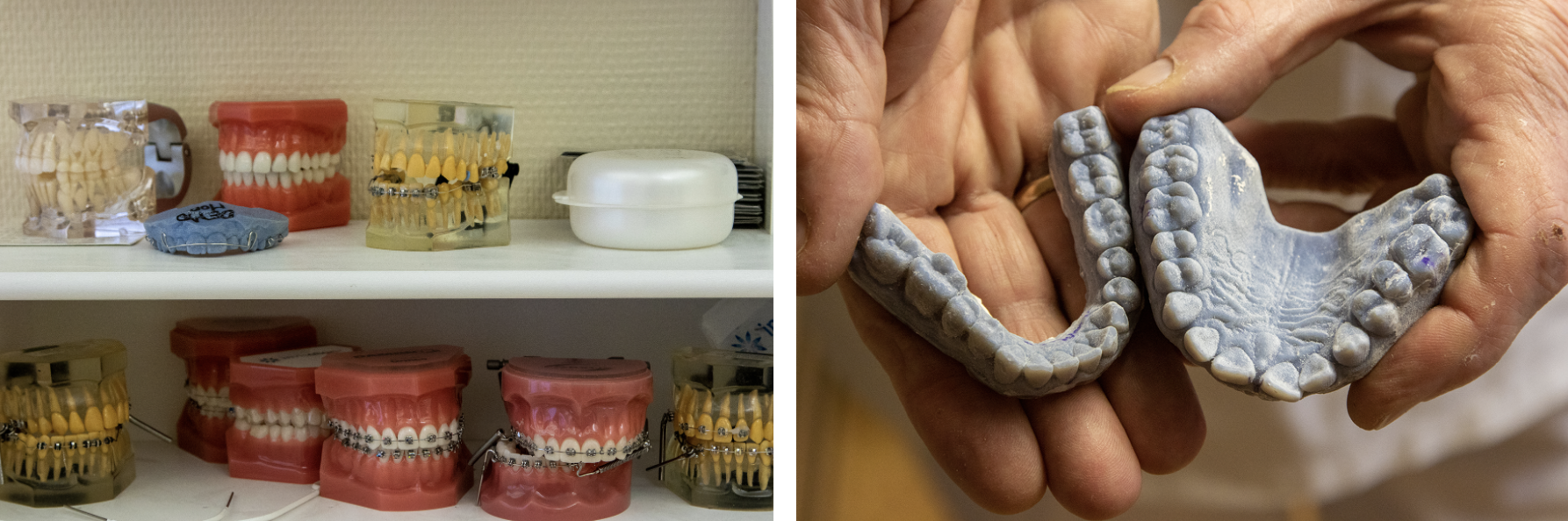 Bilde til venstre: Det er liten tvil om at vi befinner oss på en klinikk for kjeveortopedi. Bilde til høyre: En 3D-printet studiemodell av et skannet tannsett. Erik Engesæter har tatt digitale avtrykk i en årrekke.
