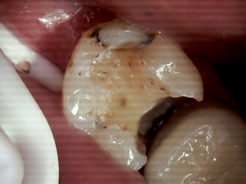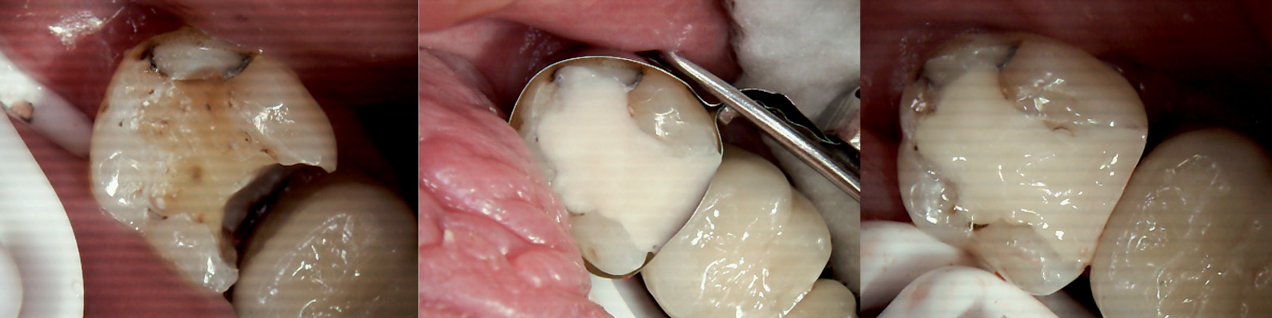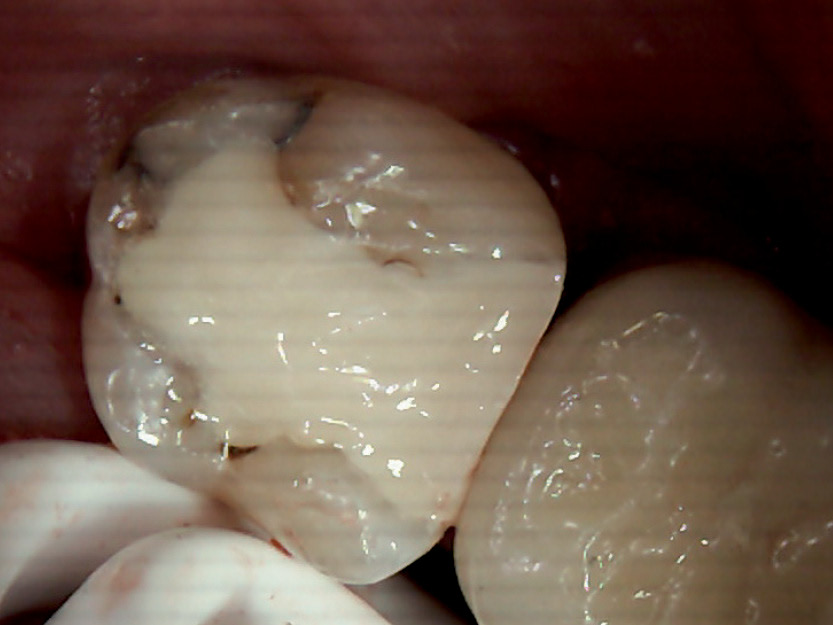 67 år gammel mannlig pasient. Dyp karies lesjon 37d og 38m. (Fig. 1) 37 behandles med en ny bro siden den gamle var slitt. 38 er et perfekt kasus for å behandle med den nye hybridglassionomeren Equia Forte fra GC, i stedet for en komposittfylling. Dette er begrunnet i den vanskelige posisjonen av kaviteten, hvor det er vanskelig å tørrlegge. Videre har denne pasienten en veldig stor og aktiv tunge, noe som vanskeliggjør behandlingen, og kofferdam går ikke å bruke på pasienten. 37 reneskaveres og det legges Fuji II LC fra GC i de dypeste kavitetene (brukt i henhold til forskriftene og lys herdet). Deretter prepareres det til ny bro. Det tas et konvensjonelt avtrykk og en 3-ledds bro blir fremstilt.