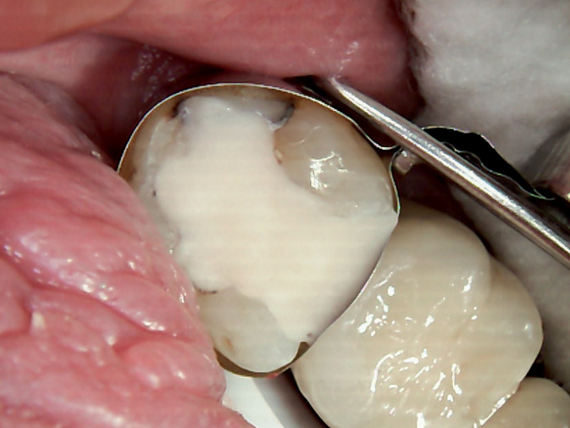 Etter matrisen og kilen er satt, gir sug og bomullsrull en tilstrekkelig fuktighetskontroll. Dentin Conditioner fra GC ble brukt, i henhold til bruksanvisningen, før tannen ble fylt med ett lag Equia Forte, i em bulk. Deretter presses det med en mikrobørste på fyllingen for å oppnå en god binding til dentinet. (Fig.3) Etter 2½ min. av initiell herdetid, fjernes matrisen forsiktig. Overflødig fyllingsmateriale poleres vekk og resten av fyllingen finpoleres med en rød pussediamant og Sof-Lex-skiver.
