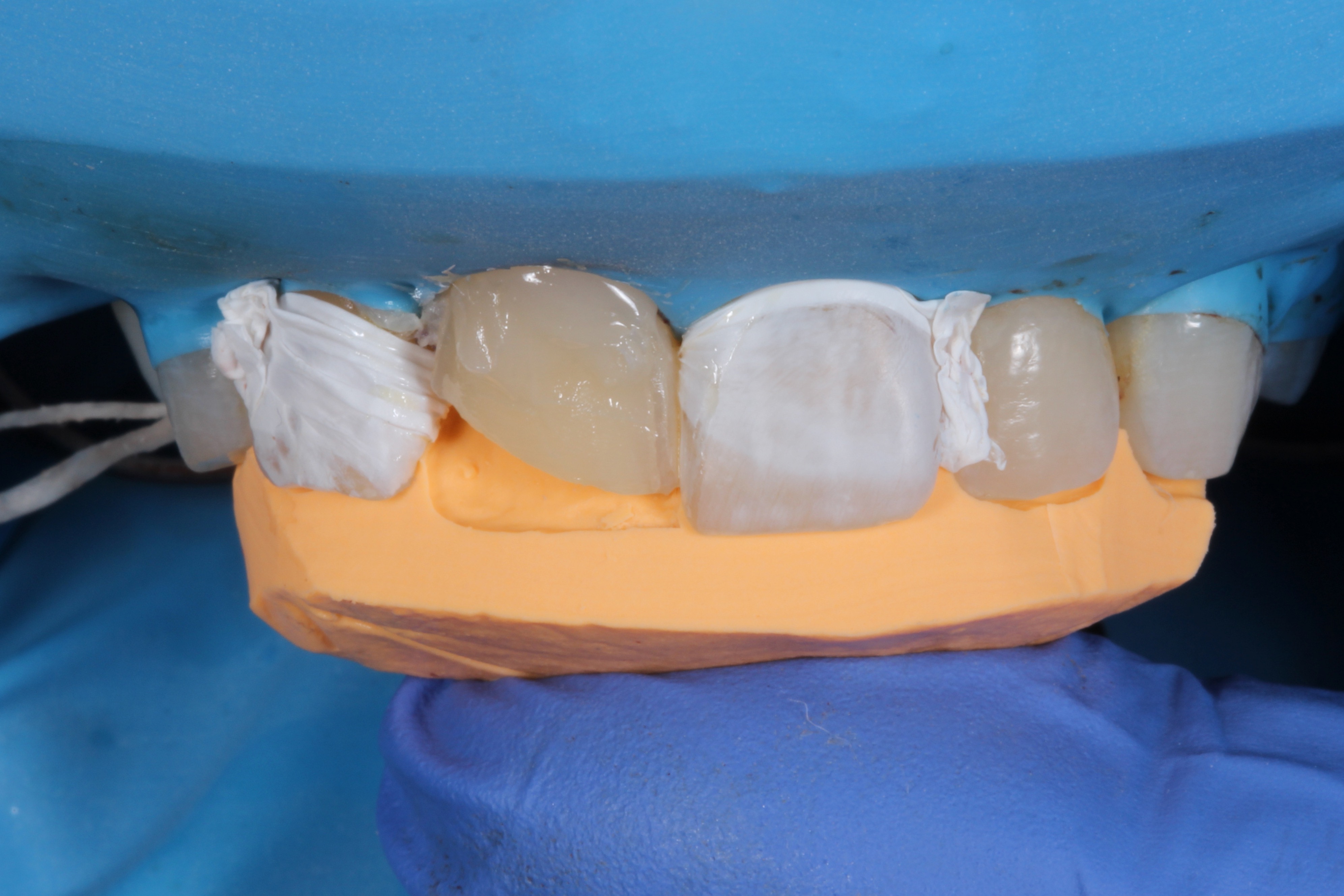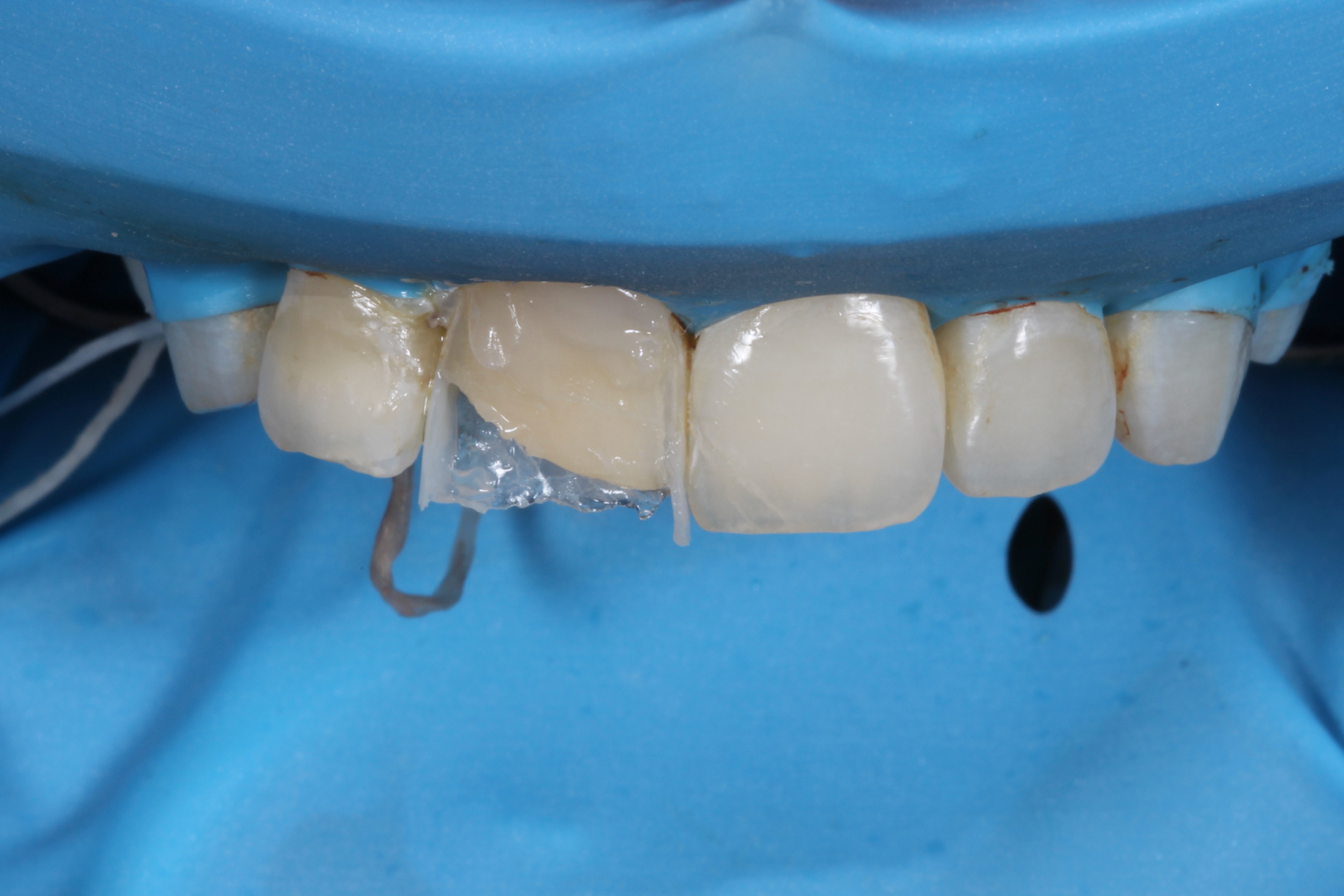 For å hindre kontaminasjon med ets og bonding, ble nabotenner isolert med teflonteip (fig 4). Emaljen ble behandlet med 37% fosforsyre, etterfulgt av universalbonding. Det ble applisert G-ænial Universal Injectable i putty-stenten som ble plassert på tannen (fig. 5 og 6). Distalt ble det benyttet en seksjonsmatrise på høykant for å oppnå riktig kurvatur på tannen.