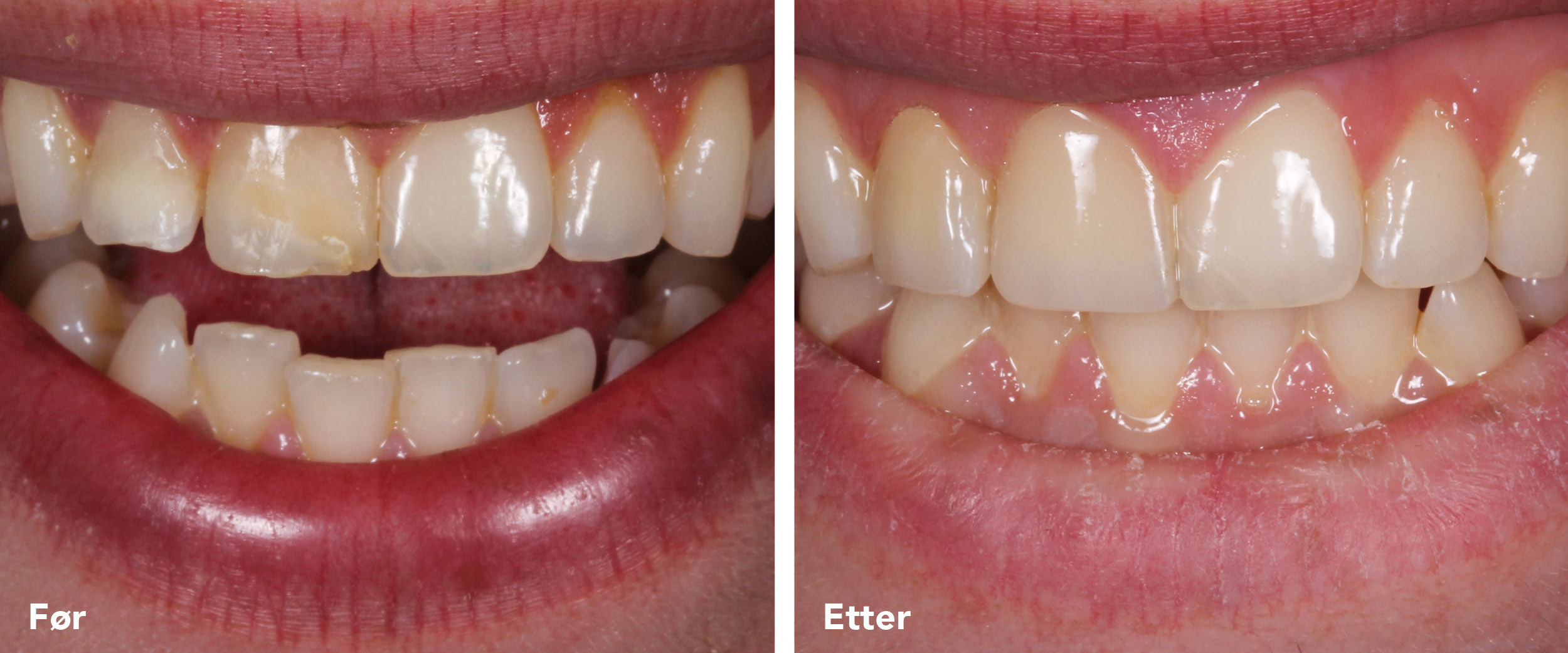 En 24 år gammel pasient med ønske om å restaurere tenner etter å ha blitt utsatt for traume (fig.1). Tann 12 hadde komplisert emalje-dentinfraktur under gingivalnivå palatinalt. 11 hadde ukomplisert emalje-dentinfraktur. Pasienten hadde fått midlertidig behandling på tannlegevakten bestående av rebonding av frakturert tannfragment på tann 12 og komposittoppbygging på tann 11. Tann 21 hadde infraksjonslinjer, men pasienten var ikke skjemmet av dette (fig. 2). Sensibilitetstest ble utført med elektrisk pulpatester, med negativ respons på 12, og positiv respons på øvrige tenner. Ingen tenner var perkusjons- eller palpasjonsømme. Direkte versus indirekte teknikk ble diskutert med pasienten, men konserverende behandling ble anbefalt for tann 11. Grunnet manglende sensitivitet og subgingival fraktur av tann 12 ble det anbefalt endodontisk behanlding med påfølgende fiberstift og krone. Pasienten samtykket til behandlingsplanen.