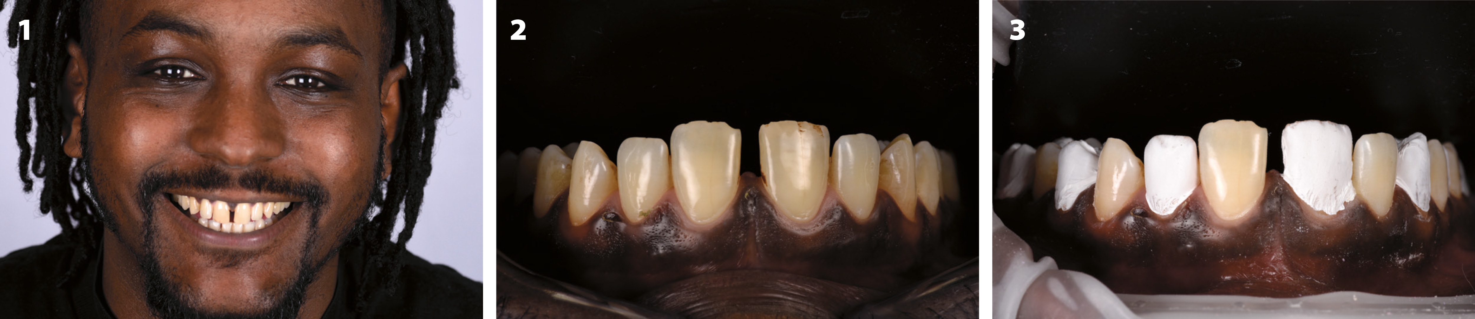 En 30 år gammel mannlig pasient kom på konsultasjon fordi han var misfornøyd med utseendet på fortennene og ønsket å lukke mellomrommet mellom tennene i overkjeve front (figur 1 og 2). Det ble gjennomført en grundig klinisk og røntgenologisk undersøkelse. Pasienten hadde ingen behandlingstrengende karies og viste god periodontal helse. Han hadde en tykk gingival fenotype og en ganske symmetrisk gingival arkitektur. Klinisk undersøkelse viste redusert hørnetannsføring ved lateral bevegelser. Pasienten ønsket en lysere farge på tennene. I den første seansen ble det tatt digital avtrykk, kliniske bilder både intraoralt og ekstraoralt samt videoer for behandlingsplanlegging og fremstilling av mock-up.