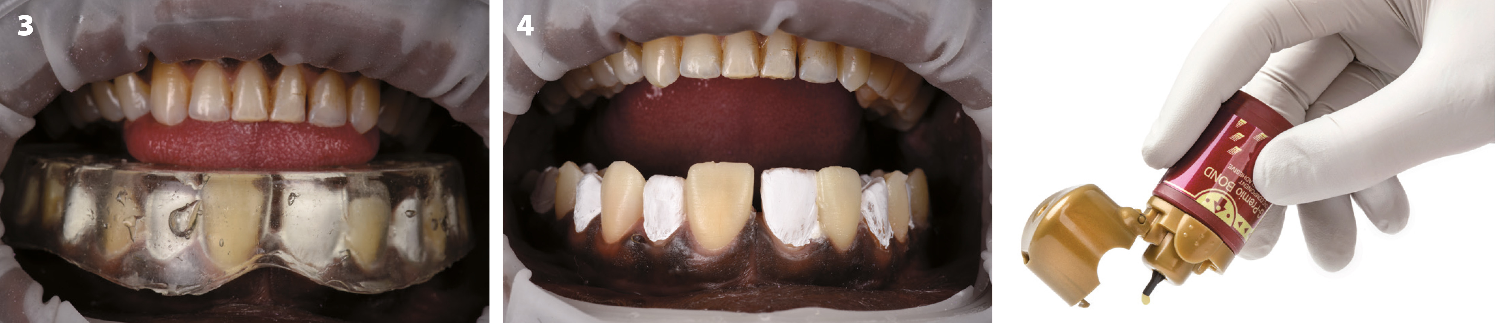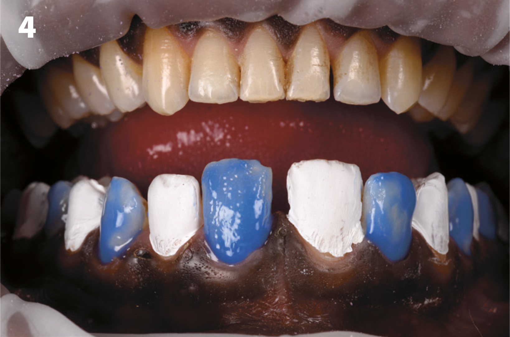 G-Premio BOND (GC) ble påført den etsede overflaten, luftblåsing deretter lysherding på annenhver tann. Silikon skinnen ble plassert og G-ænial Universal Injectable (A1) ble sprøytet inn gjennom ventilasjonshull og deretter lysherdet gjennom skinnen (figur 3 og 4). Det lages 2 ventilasjonshull incisalt i silikonindeks skinnen for å forhindre luftboble og danne utgang for overskudds materiale.