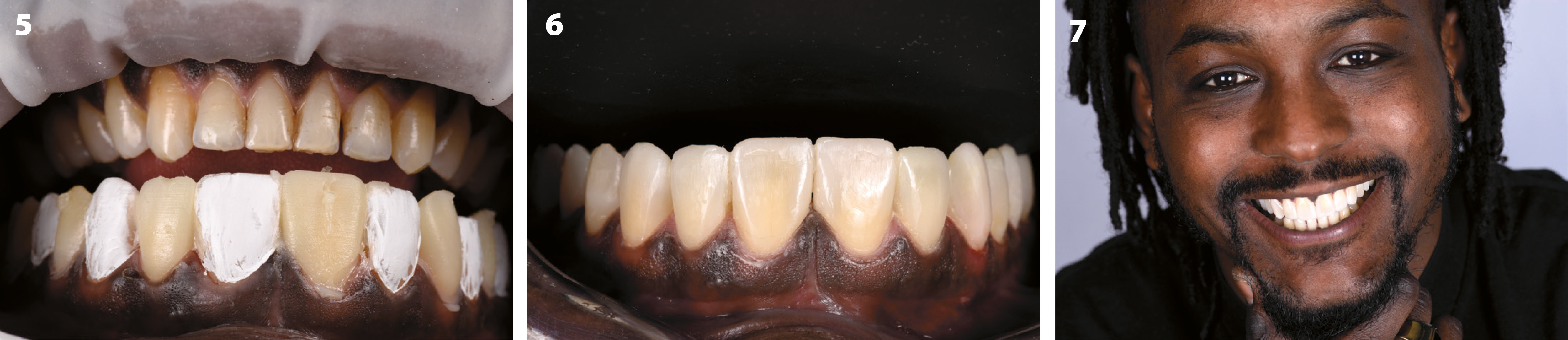 Den nye okklusjonen ble sjekket i både centric og eccentric posisjon ved hjelp av et artikulasjon papir. Ved hjelp av behandlingen ble hjørnetannsføringen gjenopprettet ved laterale bevegelser. En bittskinne anbefales å brukes på natten for å forhindre å slite ned oppbyggingen, spesielt på pasienter som gnisser tenner. Pasienten var veldig fornøyd med sluttresultatet og et godt funksjonelt og estetisk resultat ble oppnådd (figur 7).