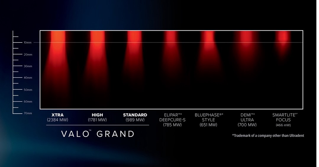 «Om du tok tre eller fire herdeomganger på pasientens tann (over de anbefalte to omgangene) med Xtra Power-modus på VALO eller VALO Grand-herdelampen, vil 2-sekunders forsinkelsen vi har bygget inn i lampen la varmen forsvinne og tannen avkjøles», sier Ultradents visepresident for R&D, Neil Jessop.
