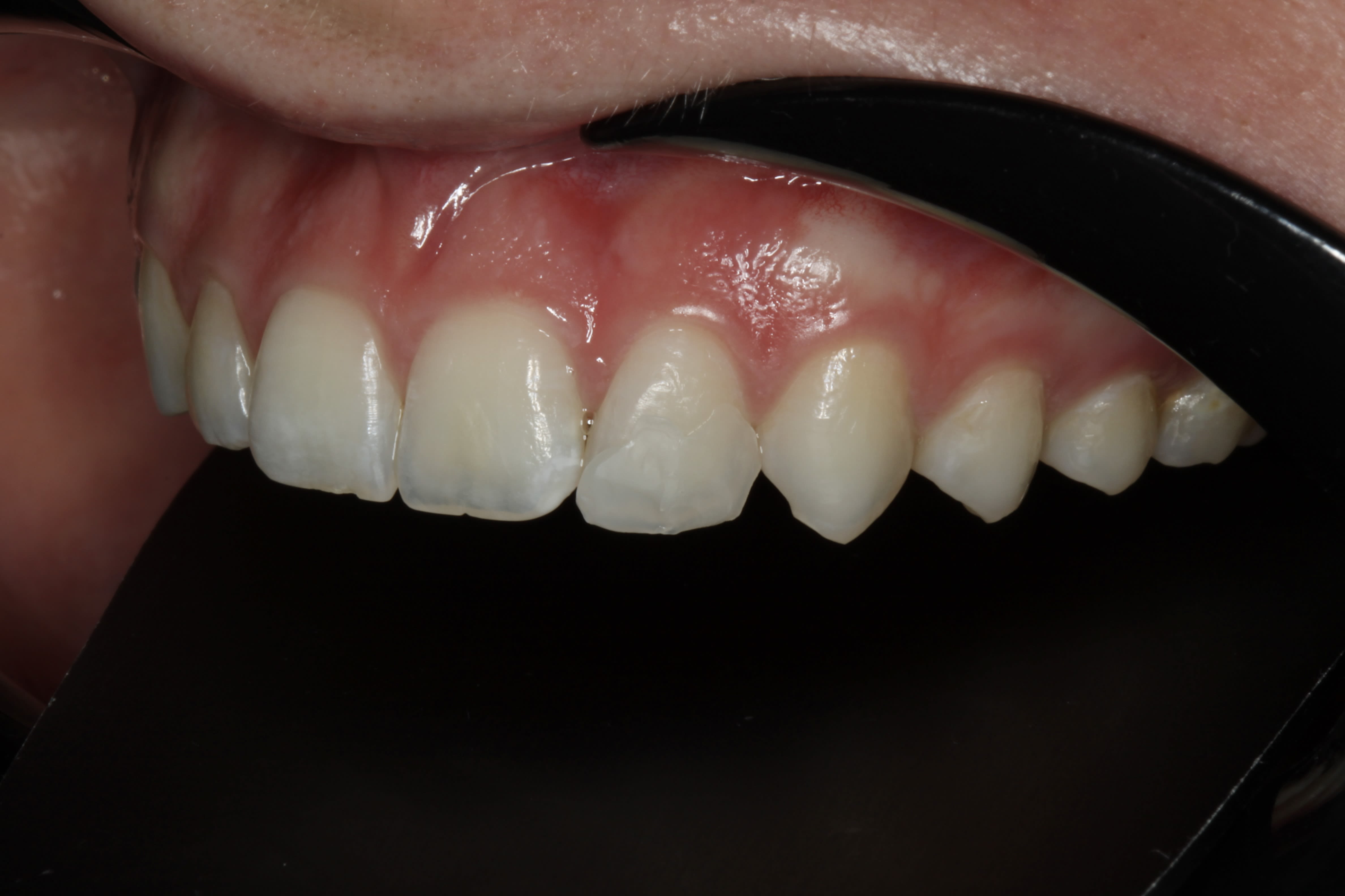 Å jobbe med små restaureringer incisalt er ekstremt komplekst. Hvis vi jobber med ulike opasiteter, har vi meget begrenset plass. Arbeid med en enkelt farge er ideell i forhold til forenkling, men vi må oppnå gode estetiske resultater. En 21 år gammel kvinne som ellers var frisk ville endre smilet sitt: «Jeg vil gjerne forbedre smilet mitt. De laterale tennene mine ser ødelagte ut, og hjørnetannen er for spiss». 3M™ Filtek™ Easy Match Materialet har en naturlig adaptiv opasitet som gjør materialet i stand til å være translucent som emalje og opaque som dentin der det trengs.
