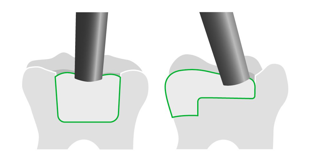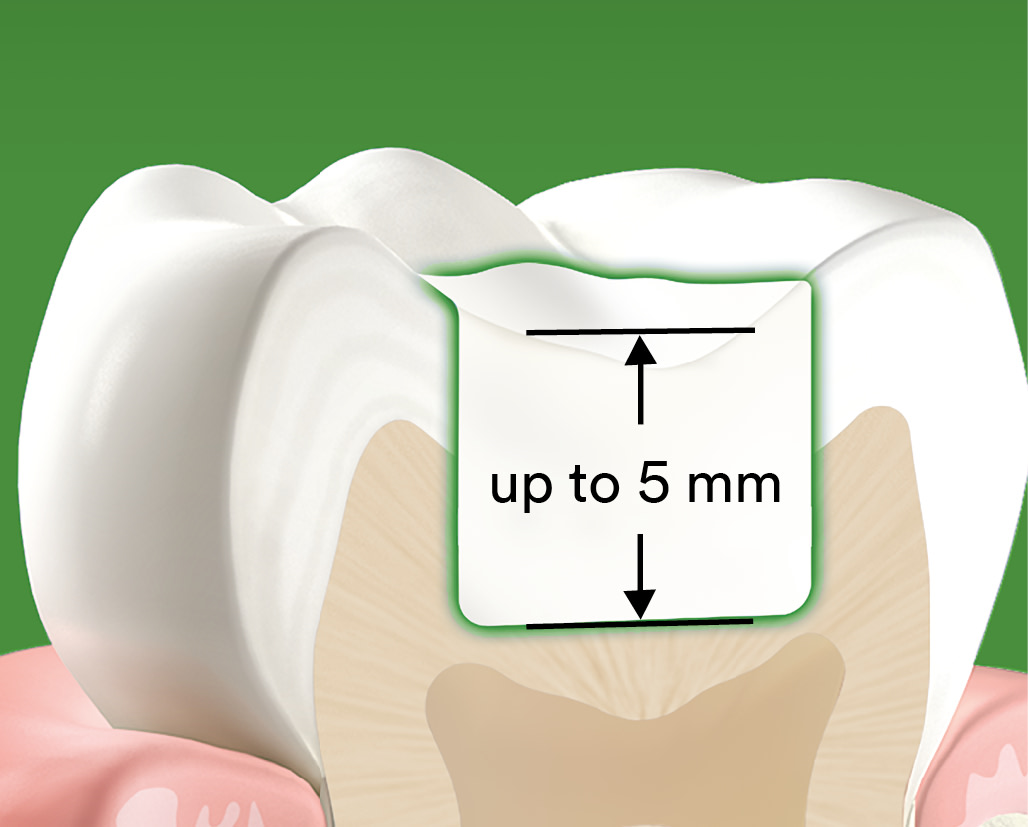 Polymeriseringsdybde. Start med å måle dybden på prepareringen for å sikre at du holder deg innenfor anbefalt polymeriseringsdybde. Det er mulig å polymerisere 3M™ Filtek™ One Bulk Fill fyllingsmateriale opp til 4 mm ved en klasse I fylling og opp til 5 mm ved en klasse II fylling. Hvis kaviteten er dypere enn dette, bør man bygge opp i lag for å sikre en optimal polymerisering.
