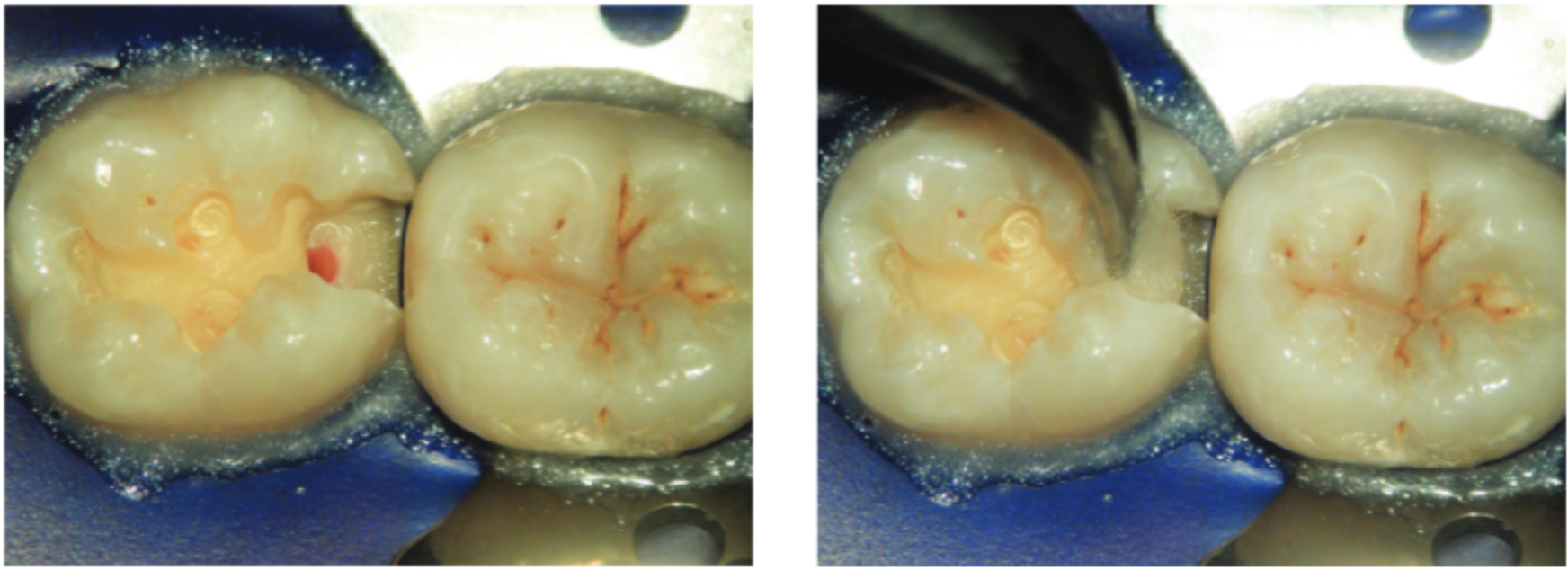 - Kontroller blødningen med trykk på eksponert pulpa ved hjelp av en bomullspellet fuktet med saltløsning (figur 2). Hvis blødningen er for stor og ikke kan kontrolleres, må det sammenholdes med det opprinnelige resultatet av istesten. I tilfeller hvor det er mistanke om irreversibel pulpitt og ukontrollert blødning, må en heller vurdere pulpektomi enn en konservativ prosedyre.