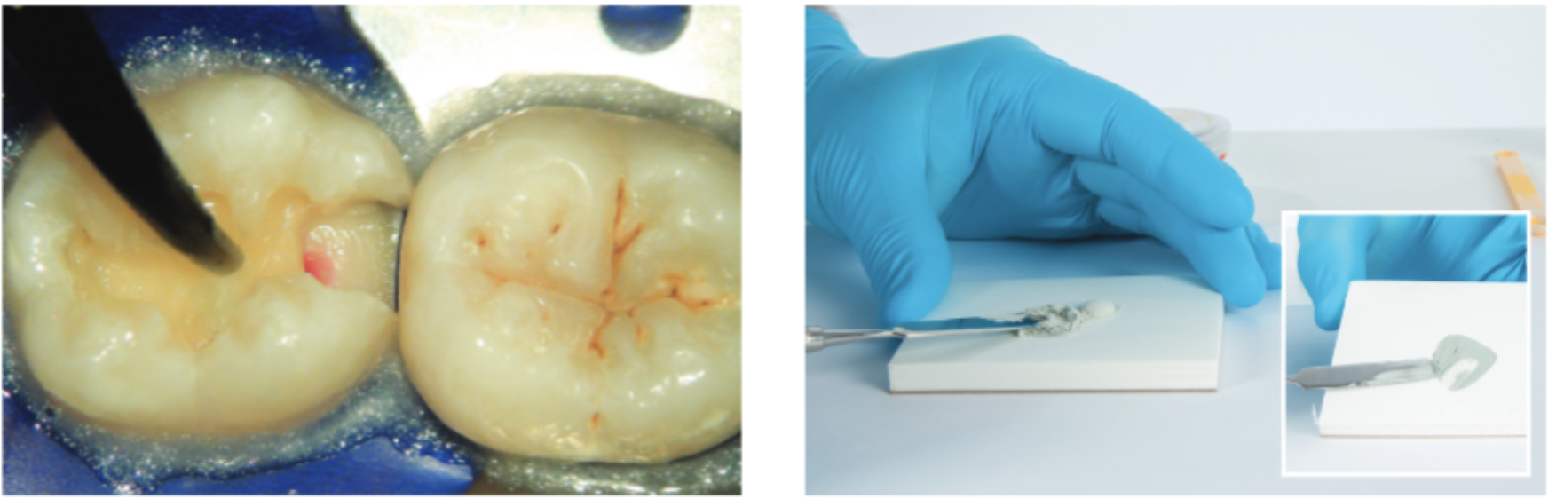 Figur 6A-6B: A. Applisering av MTAFlow på eksponert pulpa med Micro 20 ga Tip. B. Materialoverflaten blir ugjennomskinnelig etter ca. 5 minutter, og det indikerer at prosedyren kan fortsettes.
