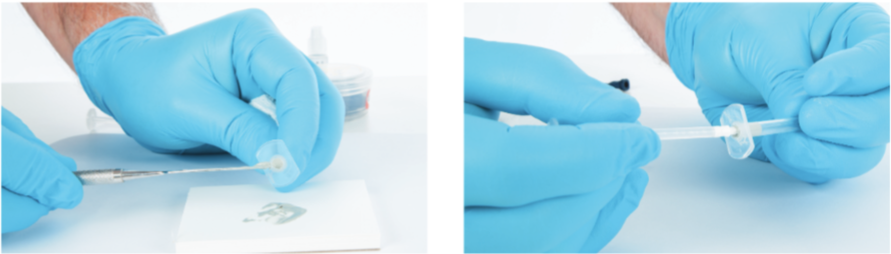 - Fest Micro 20 ga Tip forsvarlig på Skini-sprøyten. Beveg stemplet forsiktig for å fjerne luften inne i sprøyten. Kontroll av sementflow før intraoral applisering.