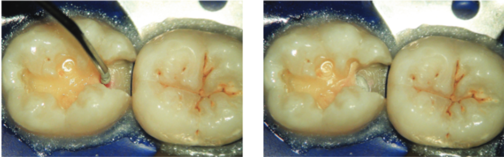 - Excaver all kariøs tannstruktur med et rundt bor ved lav hastighet, eller bruk håndinstrumenter.