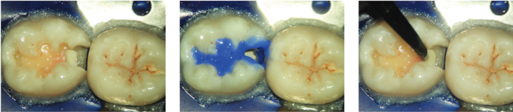 Figur 7-8-9: MTAFlow dekket av et sjikt Ultra-Blend TM Plus. Figur 8: Applisert Ultra-Etch TM etsegel 35 % fosforsyreløsning. Legg merke til hvordan Ultra-Etch forblir på plass uten å renne. Figur 9: Lysherdende Peak TM Universal Bond-adhesiv applisert med Inspiral TM Brush Tips.